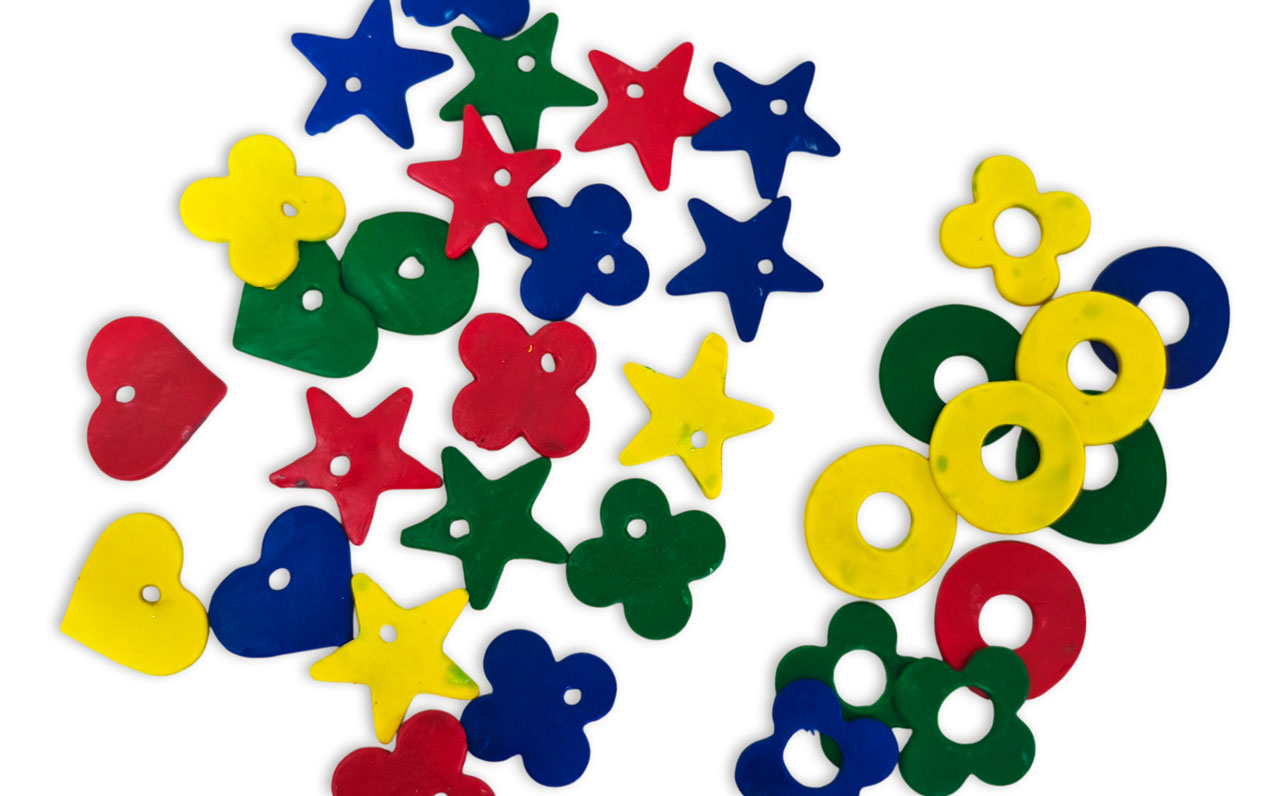 Una vez que tengas la masa estirada, usá cortantes de formas grandes para las piezas de enhebrado. “El tamaño adecuado es aproximadamente el de la palma de una mano infantil –unos 4 × 3 cm–, ya que permite buen agarre y manipulación cómoda”, explica la docente y sugiere realizar orificios de enhebrado según los diferentes niveles de complejidad en la motricidad.